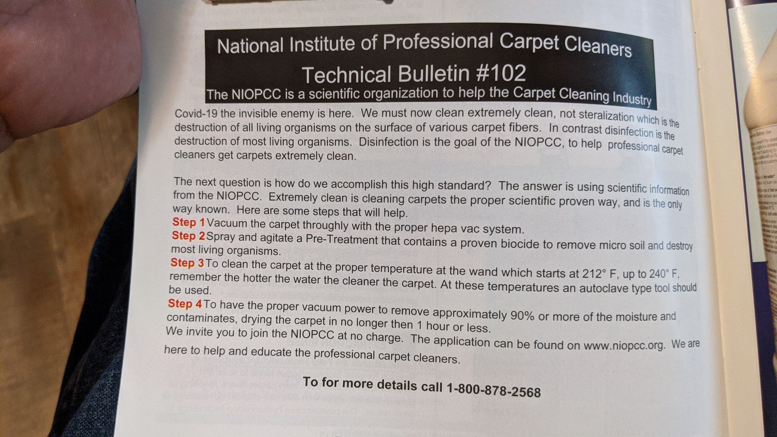 Training through NIOPCC will teach you how to get the typical soils and oily residue out of carpet and what products to use. Training includes identifying which biocides are safe to get out the bacteria, mold and spores in order to leave a carpet truly clean without endangering your health or the environment.