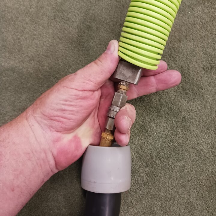 That bypass appears to be where the hose connects and youll have significant heat loss when you stop squirting solution for any length of time. Where as if you put a continuous bypass closer to the head your solution will stay hotter on a standard older prochem tool and a newer sapphire scientific tool i use a piece that i fabed up from kleanrite solvent attachment parts a small 2×1/8by 1-1/8 stainless manifold block 1- 1/8 mpt×1/8 fqc 1-1/8 mpt× 1/8 mqc and a kleanrite 1/8 mpt ×1/4 compression fitting internally threded for small bypass orifice to bypass at the attachment instead of the end of the hose works best added benefit is it is easily removed if necessary the bypass cost about 30.00 to build with off the shelf parts and can be made to work with any tool with internal solution hose so if you set the tool down to prespray or get useing vacuum for any length of time you dont have to heat up 10 or so feet of internal solution hose just squeeze the trigger and have nearly instant full heat! Better yet if you could find and use a valve that squirts when you squeeze it and bypasses when you let off the trigger. I assumed that was how the prochem tool worked with its little valve on the side but sadly not true . It bypasses but only when you squeeze the trigger