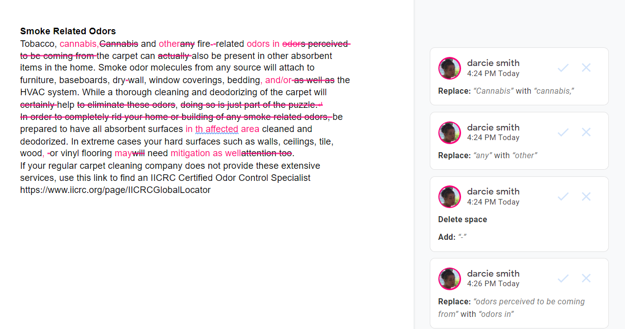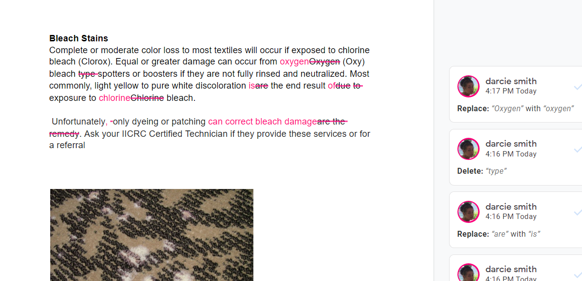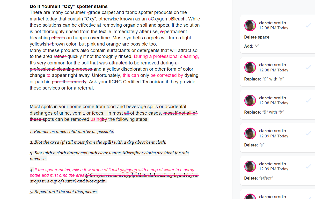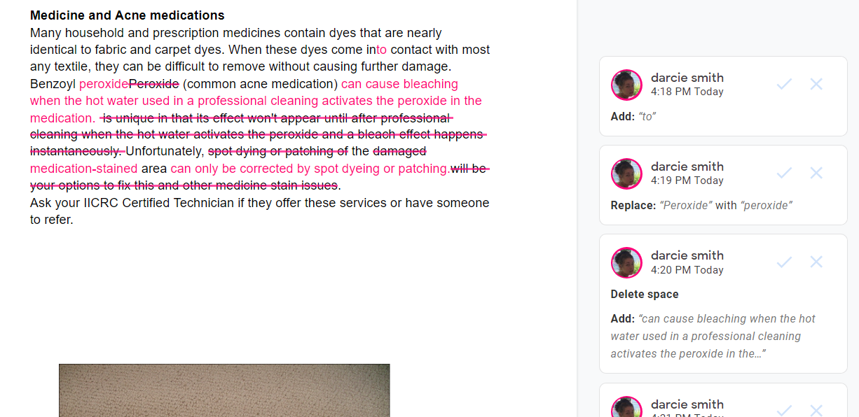 For larger (whole bottle) spills, you’ll want to extract as much of the wine as possible with a wet/dry vacuum or a carpet extractor prior to following the recommendations in the spotting guide. If the wine reached the carpet backing or pad, you may see some of the spot reappear within a few days. Mist fresh 3% Hydrogen Peroxide on the area and gently blot with a microfiber towel to eliminate the spot.