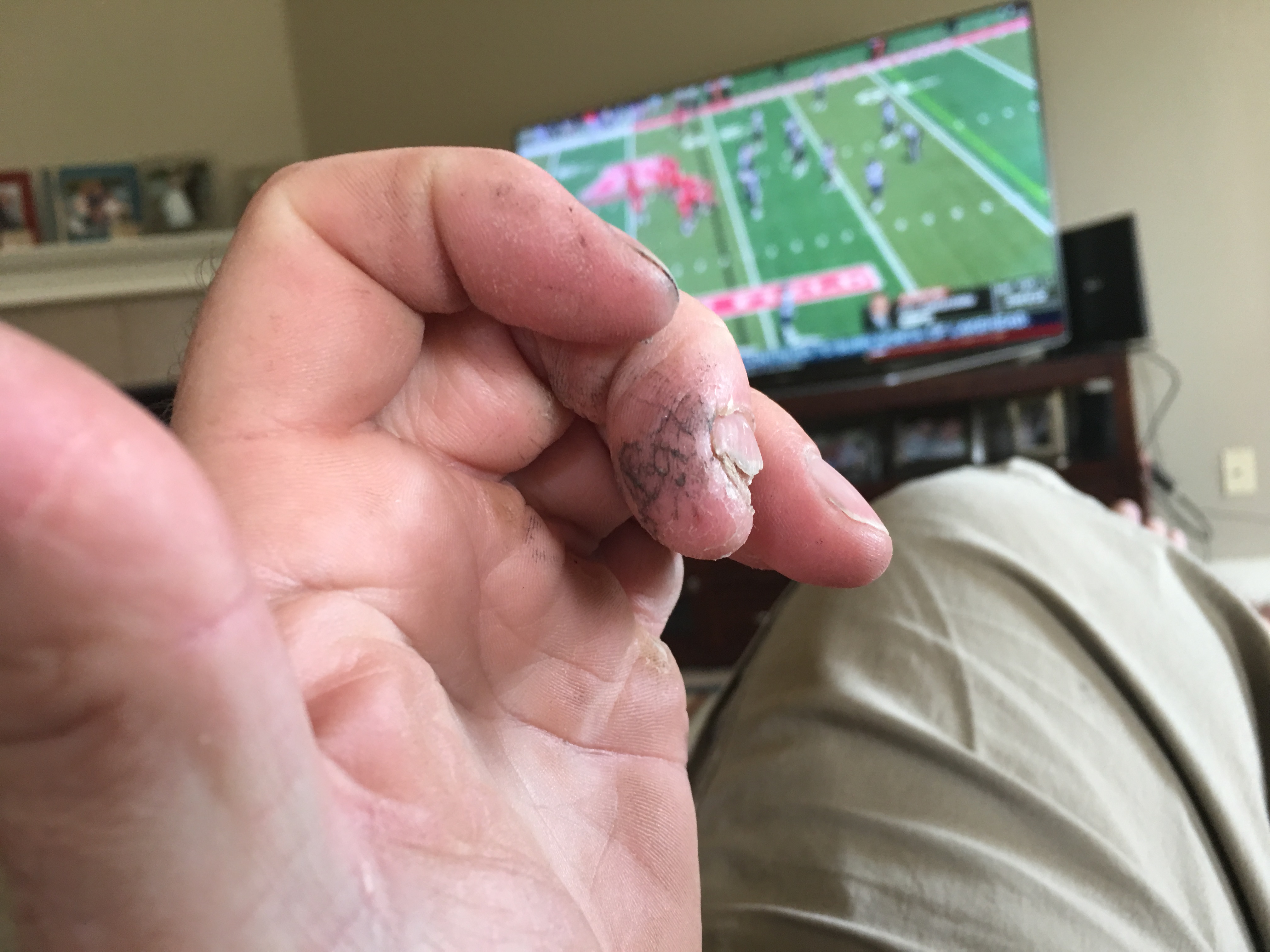 Always on the finger with the missing nail... Jeez.